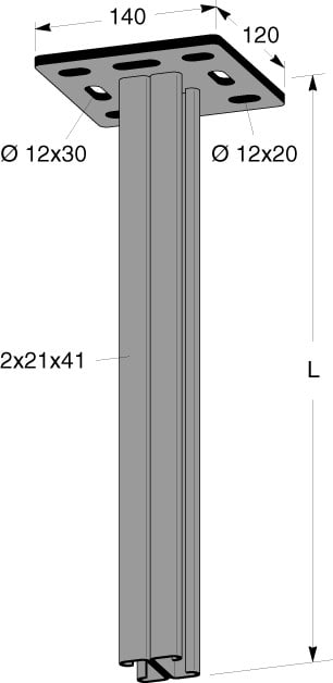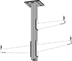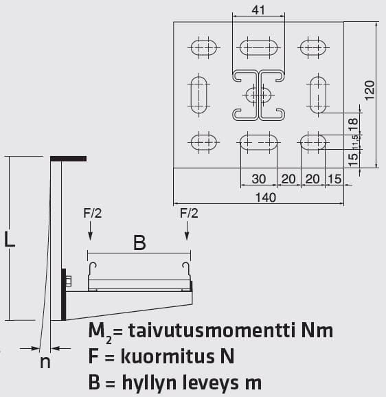 Laskeaksesi kuinka paljon katto-/lattiakannatin taipuu, laske taivutusmomentti seuraavan kaavan mukaan:M2=Fx(B+0,12)/2. Katso taipuma taulukosta valitulle kannakkeelle. Viivan päässä on suurin sallittu taipuma SS-EN 61537 standardin mukaan (1/20 kannakkeen pituudesta).