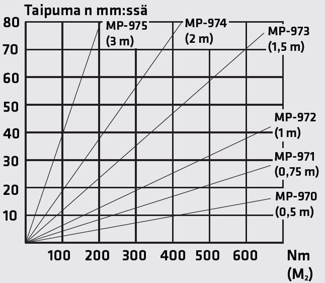 Laskeaksesi kuinka paljon katto-/lattiakannatin taipuu, laske taivutusmomentti seuraavan kaavan mukaan:M2=Fx(B+0,12)/2. Katso taipuma taulukosta valitulle kannakkeelle. Viivan päässä on suurin sallittu taipuma SS-EN 61537 standardin mukaan (1/20 kannakkeen pituudesta).