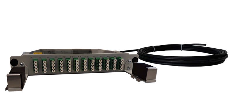 NAF1000 LCA/- HBBX 48SML 5m. Yksimuoto häntäkaapeli, jonka pituus on 5m. Mikrokaapeli on valmiiksi päätetty NAF1000 paneeliin (1U) LC-APC liittimin, joita on 48kpl. Toinen pää on avoin hitsausta varten.