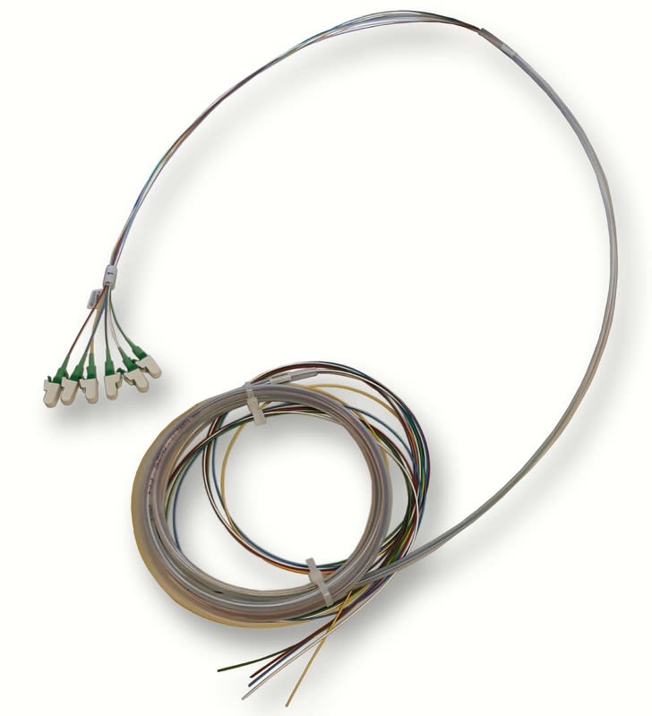 Värisarja, jossa on 6 LCA-häntää putkeen asennettuna Värisarja, jossa on 6 LC-APC-häntää putkeen asennettuna