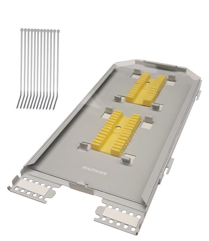 Yleinen jatkoslevy 48 kuidun jatkamiseen. Mukana tulee 4 kplkuitujatkospidikkeitä, joihin jokaiseen voi asettaa 12 kpl kuitujatkossuojia. 12 kpl nippusiteitä kaapelien ja kuituputkien kiinnittämistä varten. Jatkoslevyyn on asennettu kaksipuolinen foamtei