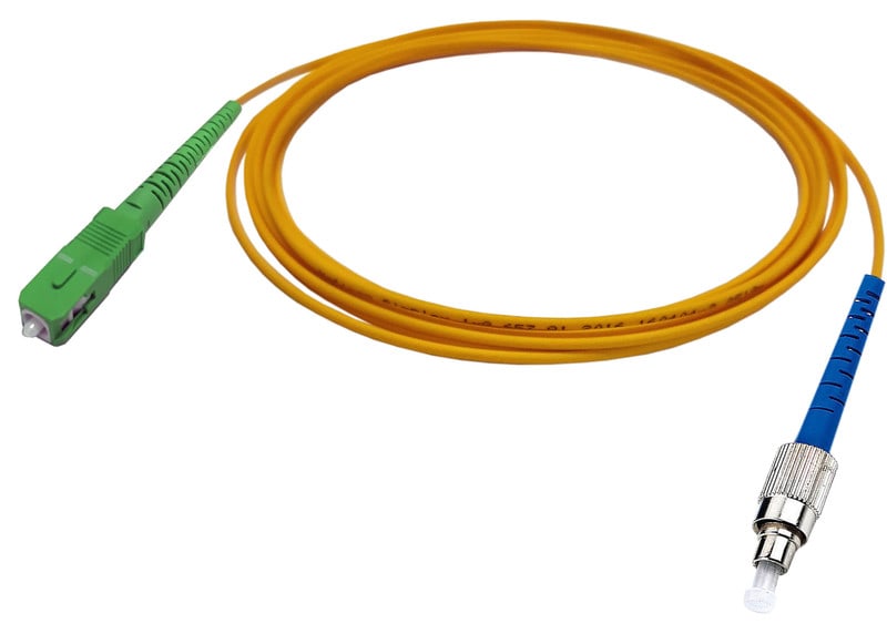 Yksimuoto kytkentäkaapeli, simplex, jossa toisessa päässä on FC-UPC liitin ja toisessa SC-APC liittimin.