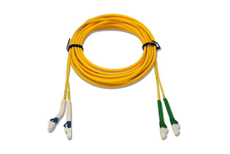 SM duplex kytkentäkaapeli, LC-UPC liittimet toisessa päässä ja LC-APC liittimet toisessa. Tuplasuojattu