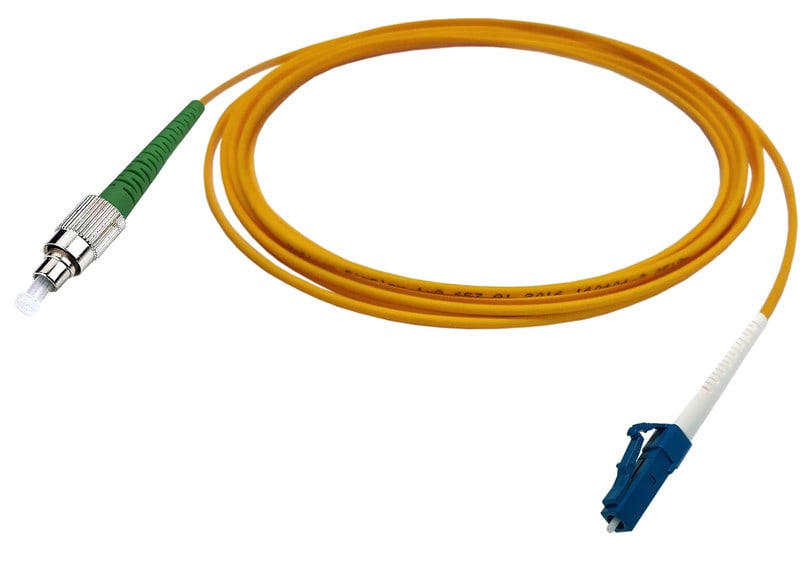 Yksimuoto kytkentäkaapeli, simplex, jossa toisessa päässä on LC-UPC liitin ja toisessa FC-APC liittimin.