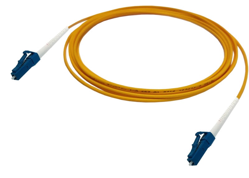 Yksimuoto kytkentäkaapeli, simplex, jossa molemmissa päissä on LC-UPC liittimet.