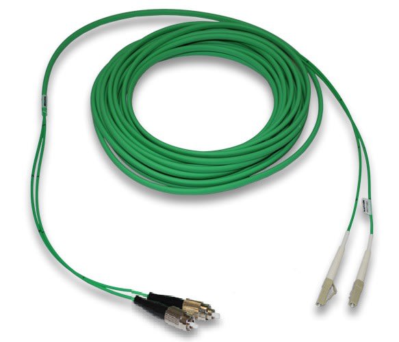 Monimuotokytkentäkaapeli, duplex tuplasuojauksella, jossa toisessa päässä on 2kpl FC-UPC-liittimiä ja toisessa 2kpl LC-UPC-liittimiä