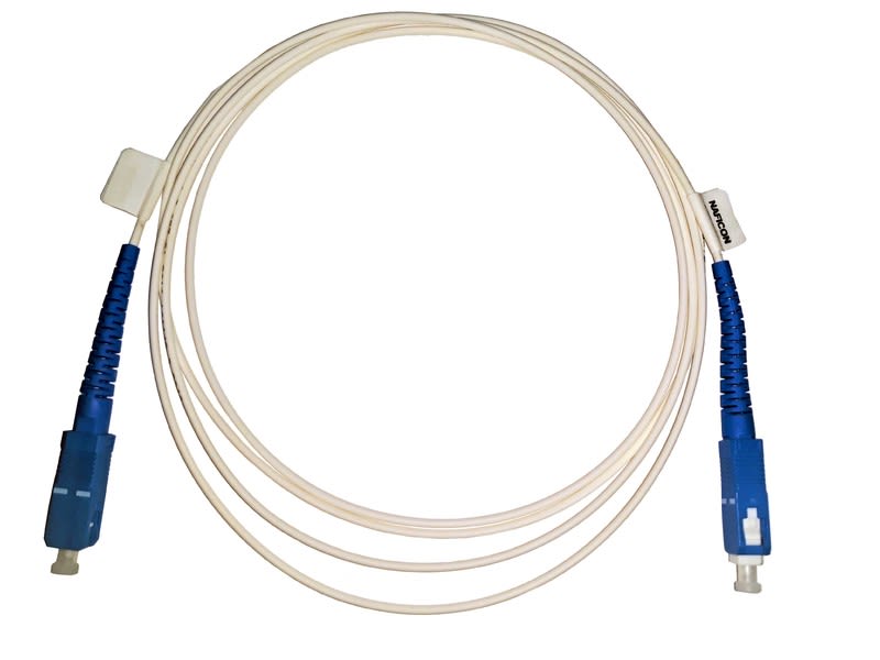 Valkoinen 2-millinen yksimuoto simplex kytkentäkaapeli, pituus 1m, molemmissa päissä SC-UPC hiottu liitin.