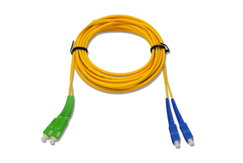 SM duplex kytkentäkaapeli, SC-UPC liittimet toisessa päässä ja SC-APC liittimet toisessa. Tuplasuojattu