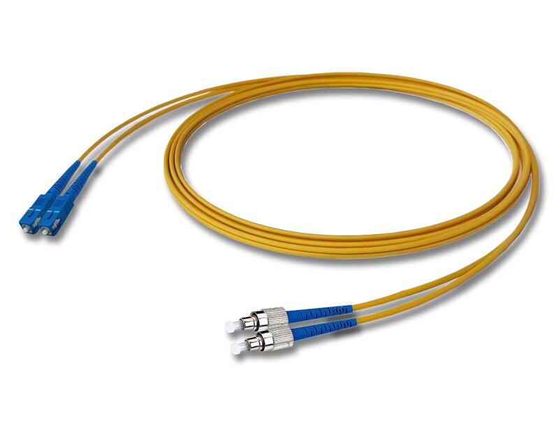 Yksimuoto kytkentäkaapeli, duplex, jossa toisessa päässä ovat SC-UPC liittimet ja toisessa FC-UPC liittimet.