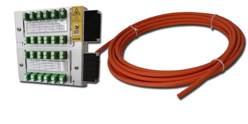 LL YJT LCA/- FZOMSU-SD 48SML 50m. Yksimuoto sisä-/ulkokaapeli häntänä, jonka pituus on 50m. Kaapeli on valmiiksi päätetty LL YJT-koteloon LC-APC liittimin, joita on 48kpl. Toinen pää on avoin hitsausta varten.