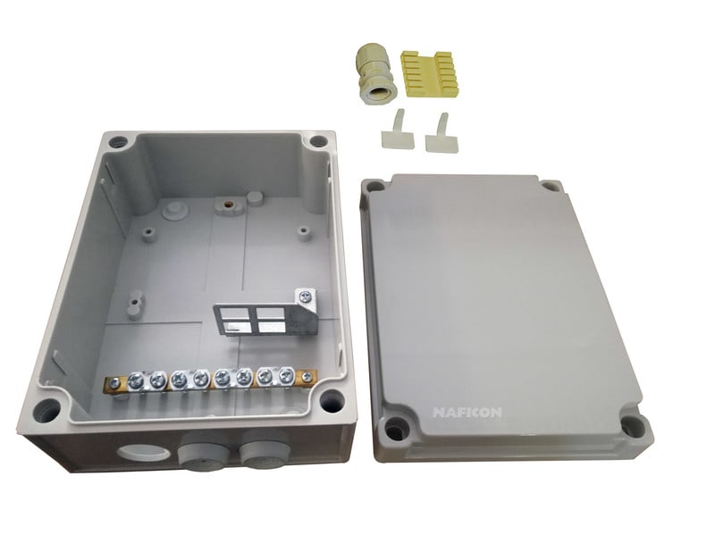 Harmaa ulos asennettava kotelo kaapelin jatkamista/laadunvaihtoa varten.Tiiveys IP67. Sisällä adapterilevy Pakettiin kuuluu kotelo, alareunaan asennettavat kaksi läpivientikumia ja yksi läpivientiholkki, pohjaan asennettavat kaksi läpivientikumia, kuitujatkospidike 12 kuitujatkossuojalle, adapterilevy (4 SC-simplex adapterille tai 4 LC-duplex adapterille), maadoituskisko ja 2kpl kuituohjaimia