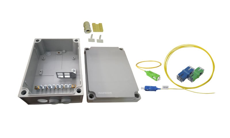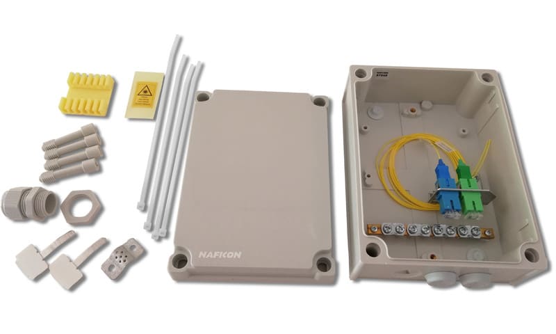 - 1kpl kotelo, jossa on alareunaan asennettavat kaksi läpivientikumia ja yksi läpivientiholkki, pohjaan asennettavat kaksi läpivientikumia, kuitujatkospidike 12 kuitujatkossuojalle, adapterilevy (4 SC-simplex adapterille tai 4 LC-duplex adapterille), maadoituskisko ja 2kpl kuituohjaimia (7263183)