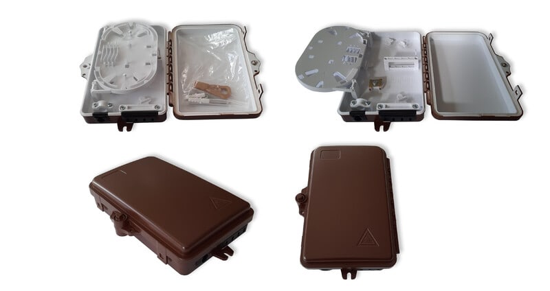 • Kotelon sisällä hitsauslevy, 1 kpl kaapelin sisäänvientiaukkojo Ø max 10mm 4 kpl ulostuloaukkoja Ø max 4mm, adapterilevy 4xSC simplex/4xLC duplex