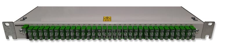 19"" jaotinpaneeli, johon asennettu valmiiksi jakaja, jonka jakosuhde on 1:64. Kuitujen päissä SC-APC liittimet.