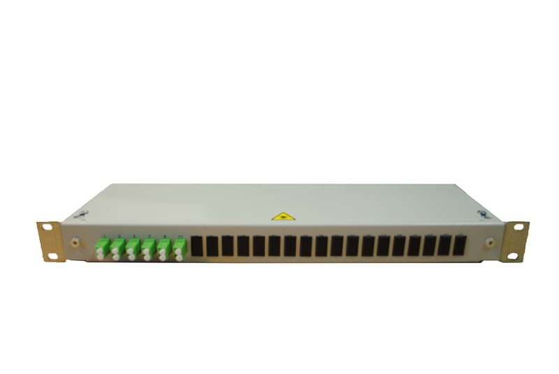 19 tuuman paneeli, johon on valmiiksi asennettu 12kpl LC-APC kuituhäntää. Paneeli ilman törmäyssuojaa.