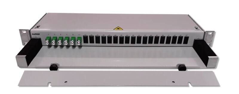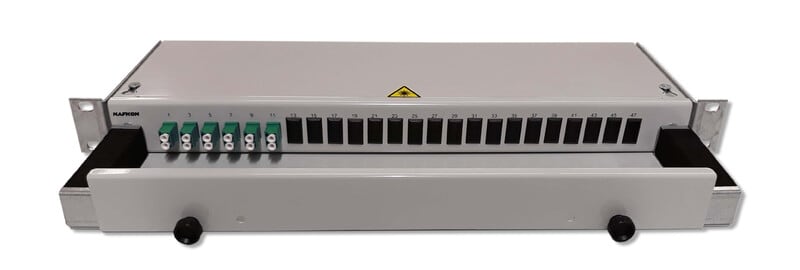 19 tuuman paneeli, johon on valmiiksi asennettu 12 APC-hiottua LC kuituhäntää