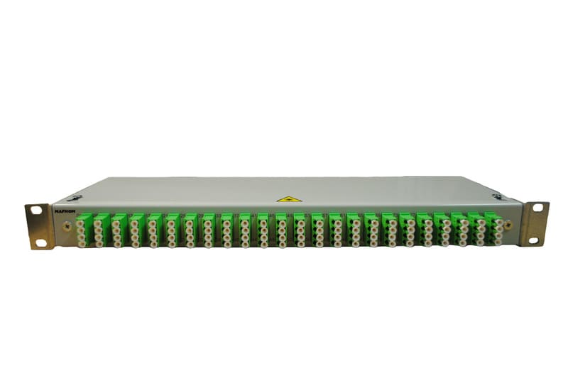19 tuuman paneeli, johon on valmiiksi asennettu 96kpl LC-APC kuituhäntää. Paneeli ilman törmäyssuojaa.