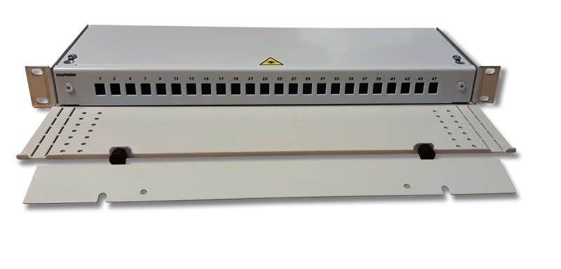 19"" paneeli, johon voi asentaa 24 LC duplex adapteria. Sivuilla vedonpoisto kytkentäkaapeleille on järjestetty nippusiteitä käyttäen. Edessä merkintälista, joka on kiinnitettävissä törmäyssuojaan. Se on saatavana myös matalana versiona. Paneelin korkeus 1U. Kaapelin voi tuoda takaaosasta sisään sekä vasemmalta että oikealta. Törmäyssuojan sivut on taivutettavissa alaspäin tarpeen mukaan.