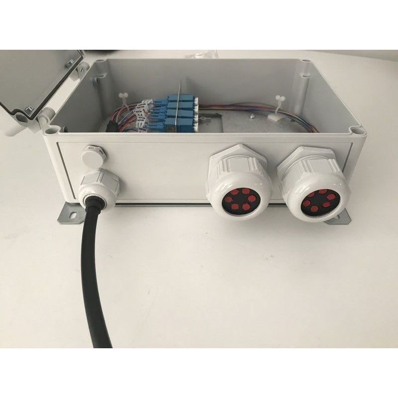 IP68 luokiteltu muovinen kotelo, jonka sisällä on liitinkenttä 12 SC/24 LC liittimille. Yksi M25 ja kaksi M42 läpivientiholkkia. M42 holkit varustettu 6x5mm läpivientikumeilla. Kotelosta saa jaettua esimerkiksi 12 talokaapelia. Pakettiin kuuluu myös erillinen kiinnityslevy. Voi myös asentaa seniään kotelon nurkista. Mitat 180x255x90mm, LxKxS