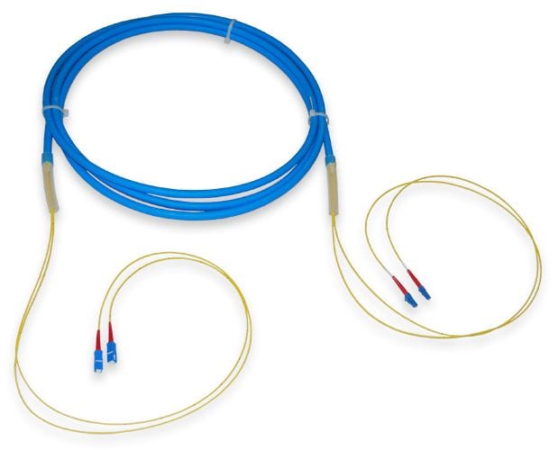 2-kuituinen urarunkokaapeli, yksimuoto, jossa on toisessa päässä SC-UPC liittimet ja toisessa LC-UPC liittimet.