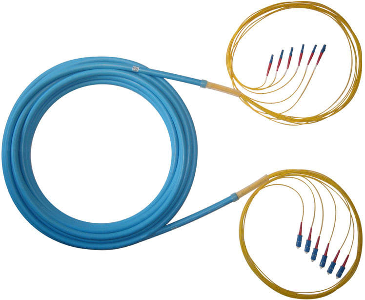 6-kuituinen urarunkokaapeli, yksimuoto, jossa on toisessa päässä SC-UPC liittimet ja toisessa LC-UPC liittimet.