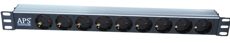 Pistorasiapaneeli 19\" kytkentätelineeseen. Paneeli sisältää 9 kpl maadoitettuja pistorasioita.