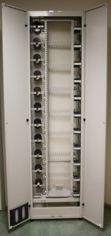 ETSI mitoitukseen perustuva valokuitujen ristikytkentäteline kääntyvällä sisäosalla. Korkeus 2000mm.