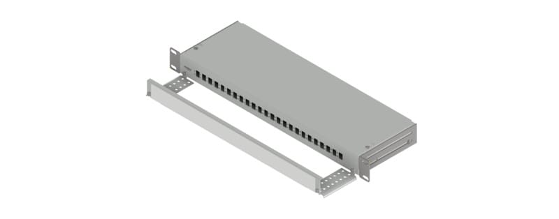 Tyhjä päätepaneeli 19 tuuman telineasennukseen. Paneelin etulevyssä on numeroidut paikat 24:lle LC-D -liitinadapterille.
