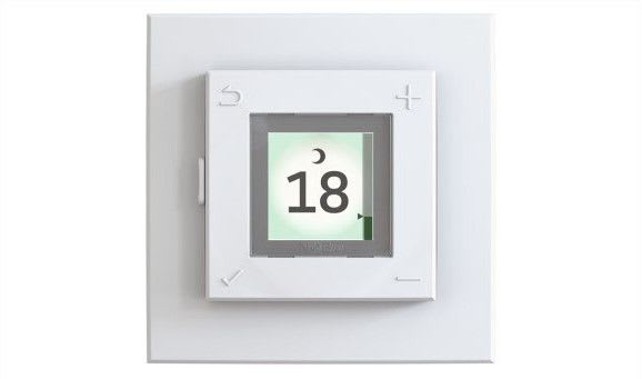 Valkoinen EcoDesign-yhdistelmätermostaatti 16A. Huone-/lattialämmitystermostaatti viikko-ohjelmoinnilla. LCD-värinäyttö.