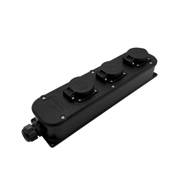 Jatkopistorasia 3-osainen läppäkansilla. Jatkopistorasian päässä on kaapelille M20 holkkitiiviste ja kotelon sisällä on vedonpoistin. Kaapeli kytketään jatkopistorasian kotelon sisällä olevaan riviliittimeen. Jatkopistorasiassa on kaivot 90° kulmassa. Jatkopistorasia voidaan kiinnittää ruuveilla kiinni alustaan. Kansi voidaan kääntää 180°. Kotelointiluokka IP54. Jatkopistorasia on rakennettu kestäväksi ja täyttäästandardin IEC 60884-1:2022 vaatimukset.
