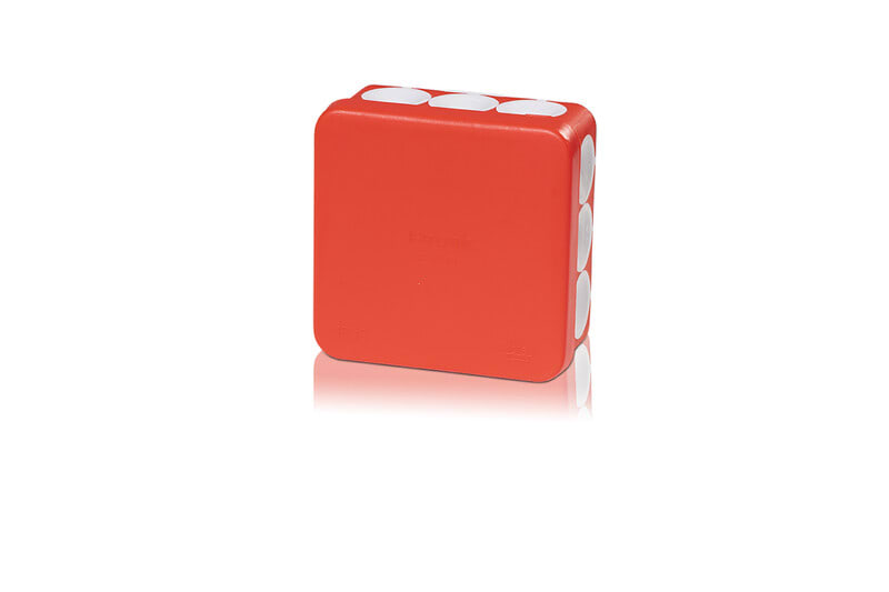 Jakorasia kalvoilla. Liittimen koko 2,5mm². Kotelointiluokka IP55. Kolmekalvoläpivientiä jokaisella sivulle = 12 kpl yhteensä ja kaksi pohjassa.Väri punainen. Jäykkärunkoinen jakorasia pehmeillä kalvotiivisteillä. Tiivisteitä on kolme joka sivulla (yhteensä 12 kpl) ja pohjassa kaksi läpivientiä. Jakorasia on hyväksytty 400V ja 2,5 mm² kaapeleille. Alin asennuslämpötila on -25⁰C. Kotelointiluokka on IP55