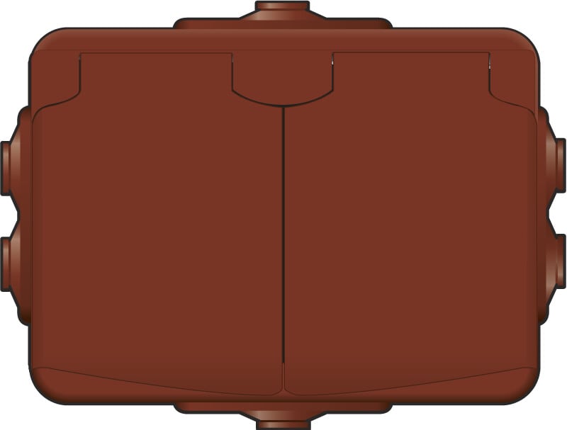 Pinta-asennettava koteloitu 2-osainen maadoitettu pistorasia turvasuluin. Kotelointiluokka IP44. Pistorasiassa on ruuviliittimet. Liittimet ovat hyväksytty sekä ML että MK johtimille. Pistorasiassa on kalvoläpiviennit kaapeleille ylhäällä, alhaalla ja sivuilla.