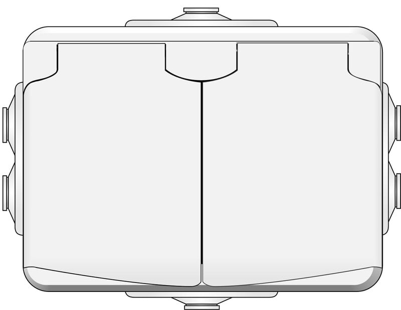 Pinta-asennettava koteloitu 2-osainen maadoitettu pistorasia turvasuluin. Kotelointiluokka IP44. Pistorasiassa on ruuviliittimet. Liittimet ovat hyväksytty sekä ML että MK johtimille. Pistorasiassa on kalvoläpiviennit kaapeleille ylhäällä, alhaalla ja sivuilla.