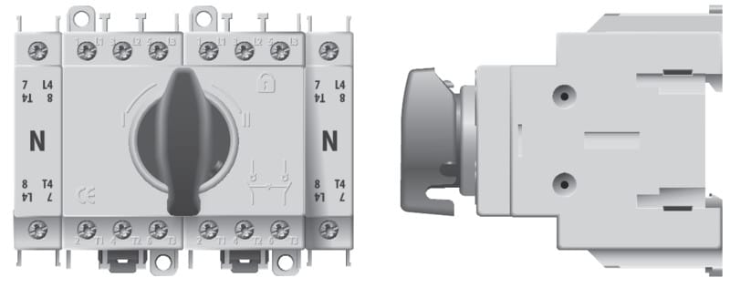 DIN-kiskoon keskuksiin asennettava verkonvaihtokytkin pääkytkimen tilalle. Kytkimen leveys 6 moduulia. Jos keskuksessa ei ole tilaa, voidaan käyttää koteloitua verkonvaihtokytkintä.