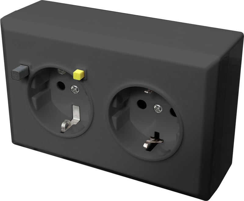 NRCD 22 SM S on 2-osainen maadoitettu pistorasia turvasuluin jossasisäänrakennettu 30mA vikavirtasuoja pinta-asennukseen, 16A/250V.Kotelointiluokka IP21. Väri musta