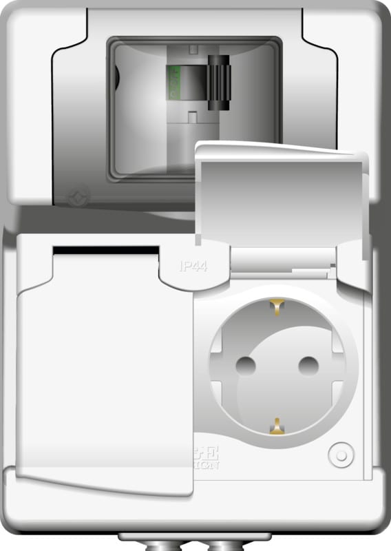 Maadoitetun turvasuluilla varustetun 230V kaksoispistorasian ja 2-napaisen C10A/30mA henkilösuojan yhdistelmä. Henkilösuoja on A-tyyppiä 30mA ja C10A sulakkeella.