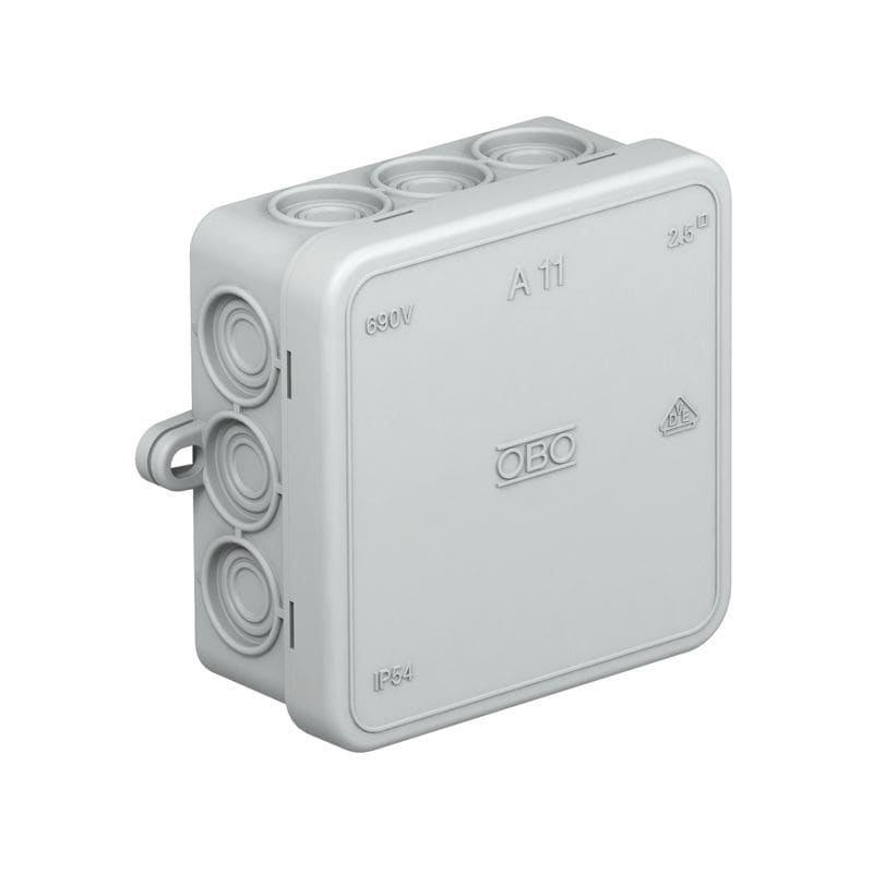 Suojausluokka IP55, nimellisjännite 660 V, nimellispoikkipinta 2,5 - mm², 12 aihiota kaapeleille, läpimitta 8-14 mm. Painokansi. Mitat: 85 x 85 x 40 mm Vapaat sisämitat: 75 x 75 x 35 mm 10 rasiaa kohden 2 lävistyskärkeä. Kaapelit voidaan asentaa pohjan kautta suoraan seinän lävitse tai läpimenot voidaan merkitä seinään porausta varten.