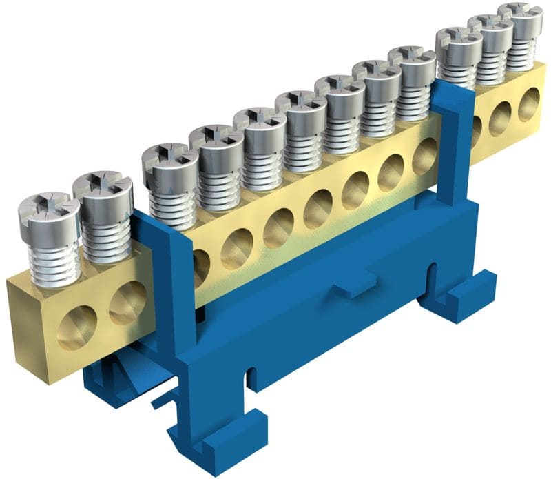 12- napainen 16 mm². Liitinkisko messinkiä, ruuvit terästä, galvaanisesti sinkitty ja läpinäkyväksi passivoitu, kiinnitetään asennuskiskoihin 35 mm DIN EN 50022 mukaan (poikittain) tai lattakiskoihin 10 x 2-2,5 mm (pitkittäin).Kiinnityspohja polyamidia.