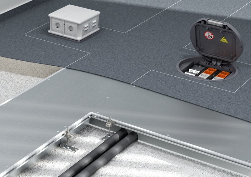 Kanavat voidaan avata koko pituudeltaan joten ne sopivat erinomaisesti asennuksiin, joissa johdotuksia pitää muuttaa tai lisätä. Kanavaan asennettavat valurasiat asennetaan kanavan viereen, jolloin saadaan mahdollisimman suuri hyötypoikkipinta-ala kaapeleille. Tällöin tulee asennussyvyydeksi varata vähintään 80mm, jotta kojerasiat ja pistotulpat mahtuvat suljetun kannen alle. Kanavan kanteen on saatavana myös aukkokansi, johon lattiarasia voidaan asentaa. Lisätietoja PDF-esitteen sivuilla 4 ja 16.