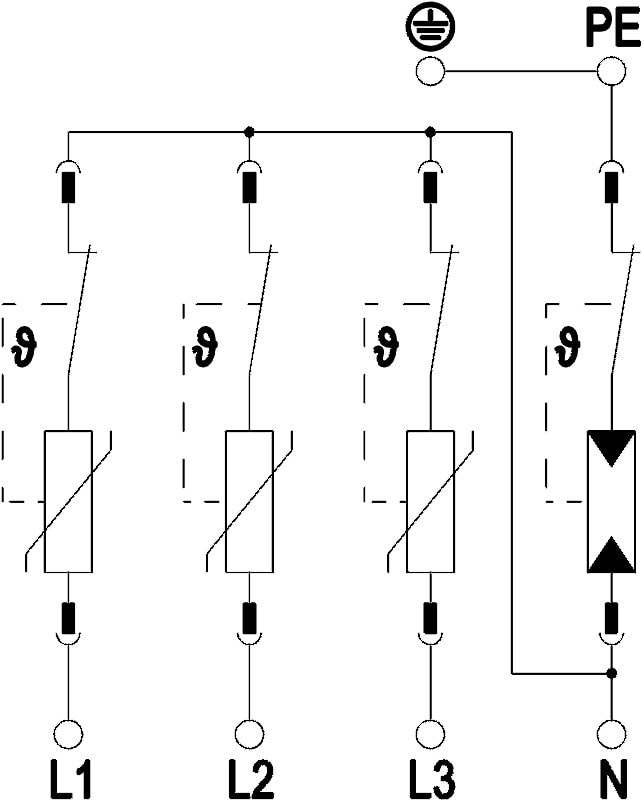Ylijännitesuoja V20-3+NPE-280 T2, 3L+N+PE Tyypin 2 ylijännitesuojia käytetään ylijännitteiden rajoittamiseen sähkölaitteissa. Ylijännitesuojat pitää asentaa ennen vikavirtasuojaa (RCD), koska se tulkitsee muutoin syöksyvirran vikavirraksi ja katkaisee virtapiirin.