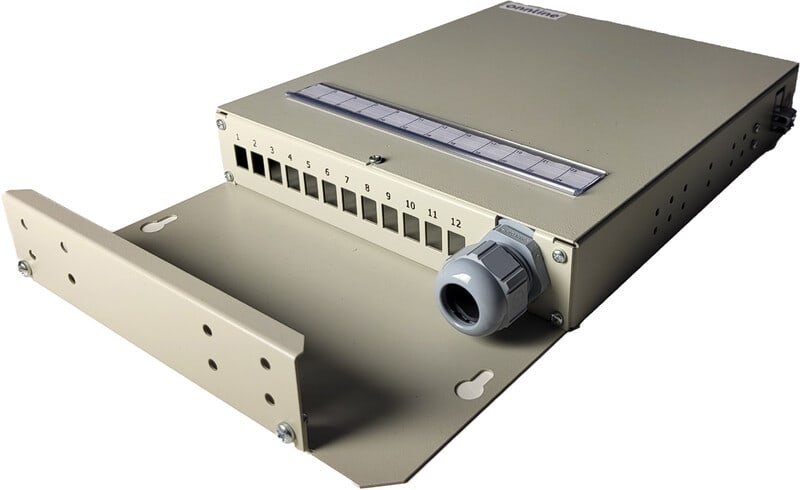 Päätekotelo TT-12 SC: seinäasennus 220x(260+110)x44 mm, 12 SC-adapteripaikkaa, yksi jatkoslevy jossa 12 kuitujatkospaikkaa, kaapeliläpiviennit, törmäyssuoja, merkintäliuska