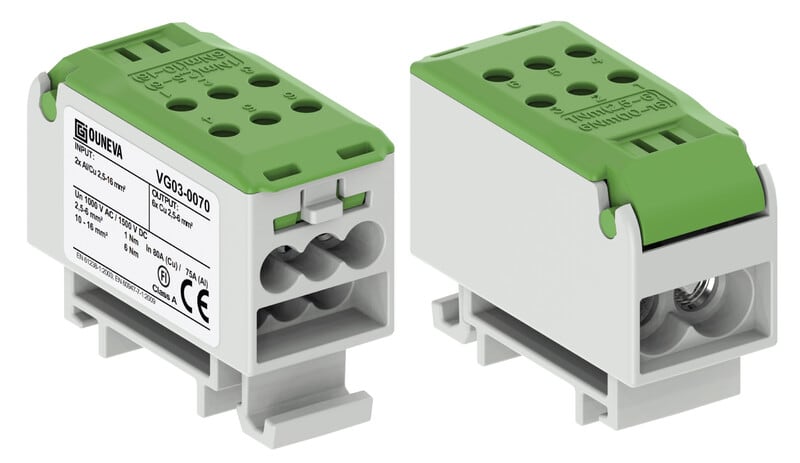 1-vaiheinen OJL-liitin on tarkoitettu sähkölaitteiden haaroituskytkentöihin. Liittimessä on 2 syöttöjohdinaukkoa ja 6 haaroitusjohdinaukkoa. Liitinrungon materiaalina on käytetty tinapinnoitettua alumiinia ja kotelo PA66 V0.