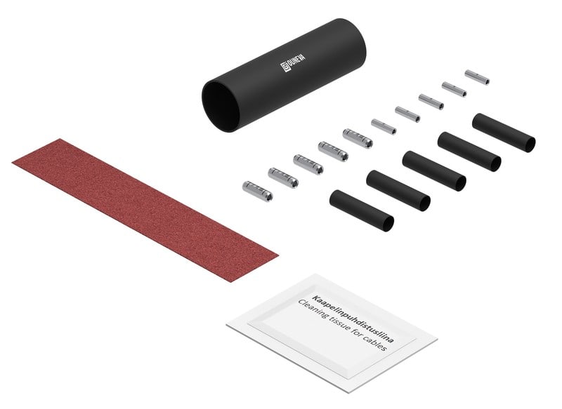 Pakkaus sisältää kymmenen jatkoliitintä, viisi liimallista johdinkutistetta, yhden liimallisen kaapelikutisteen, hiomapaperia ja kaapelinpuhdistusliinan.