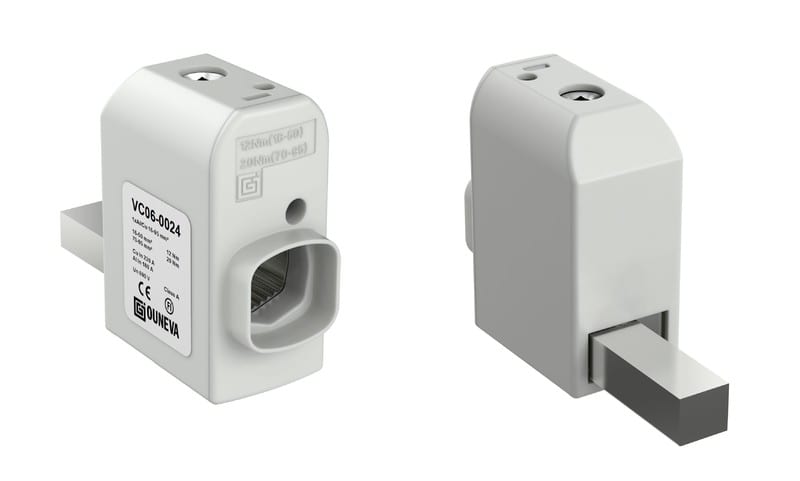 Kojeliittimiä käytetään Al- ja Cu- johtimien liittämiseen sähkökojeistoissa ja sähkölaitteissa. Liitin on valmistettu alumiinista ja pinnoitettu tinalla. Kosketussuoja on polyamidia. Oikeakätinen malli.