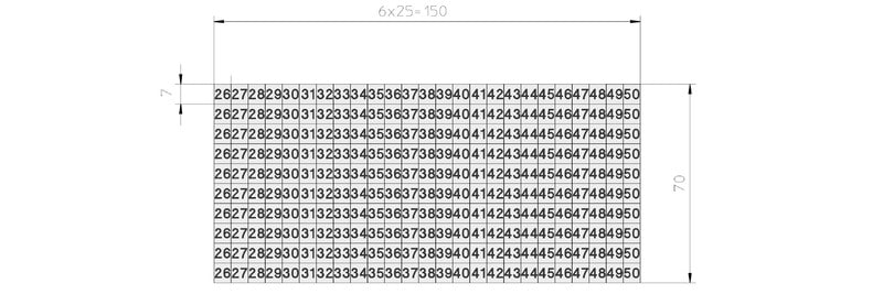 Merkintätarra, N:o 26-50 6 mm2 Cu-tunneliliittimelle Sisältää kymmenen riviä numeroituja tarroja. Numerot 26-50. Sopii 6 mm² Cu-tunneliliittimelle.