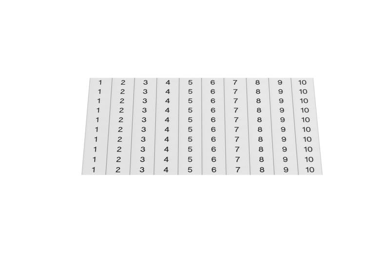 Merkintätarra, No. 1-10 35 mm2 Cu-tunneliliittimelle Sisältää kymmenen riviä numeroituja tarroja. Numerot 1-10. Sopii 35 mm² Cu-tunneliliittimelle.