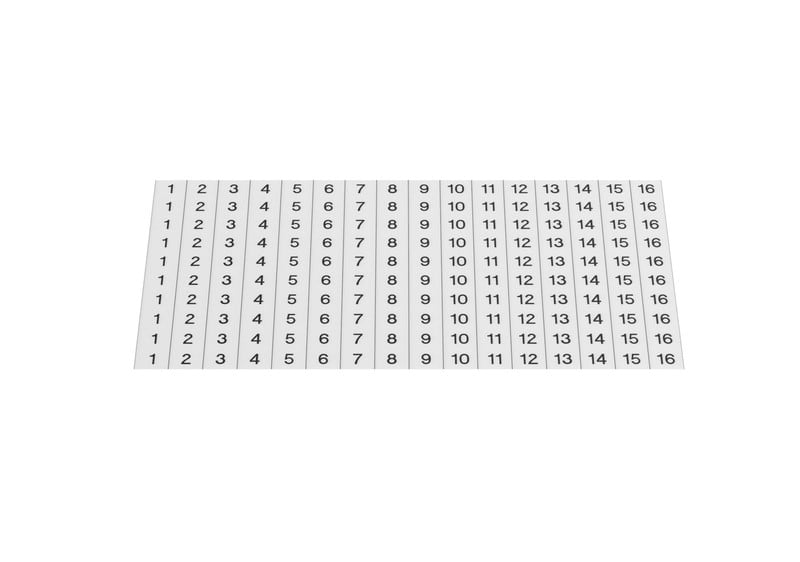 Merkintätarra, No. 1-16 16 mm2 Cu-tunneliliittimelle Sisältää kymmenen riviä numeroituja tarroja. Numerot 1-16. Sopii 16 mm² Cu-tunneliliittimelle.