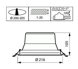 - Upotusaukon halkaisija: 200-205 mm