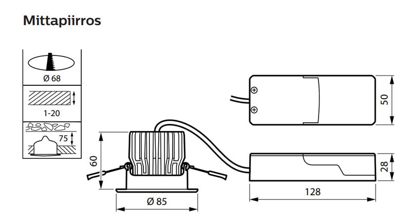 - Asennusaukon halkaisija: 68 mm