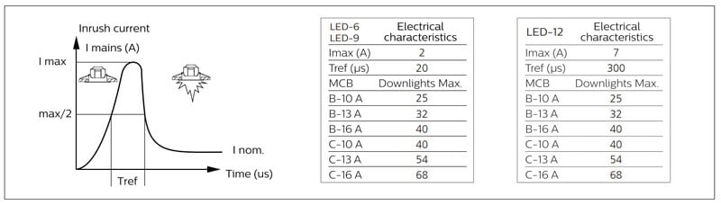 Enimmäismäärä valaisimia, johdonsuojakatkaisija C16: